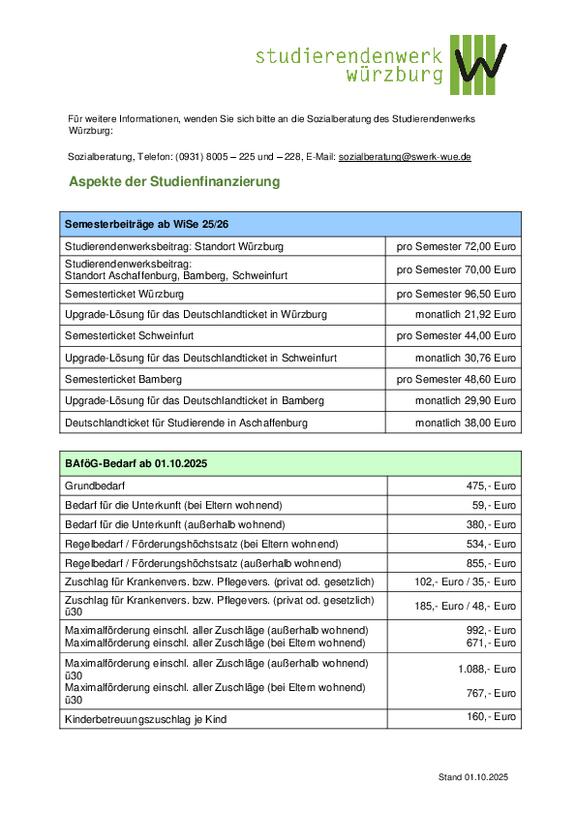 Damit Sie ohne Geldsorgen durchstarten können, haben wir hier alle Infos rund ums Geld zusammen gestellt. Vom BAföG bis hin zum Selbstverdienten! Ebenso finden Sie hier nützliche Infos zu Versicherungen und zu diversen Vergünstigungen.