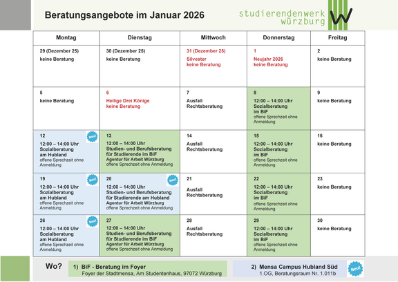 The schedule indicates where the consultations will take place (BiF at the student house or at our counseling center at Hubland Süd in Würzburg), as well as whether they are open consultation hours or appointments that require registration.