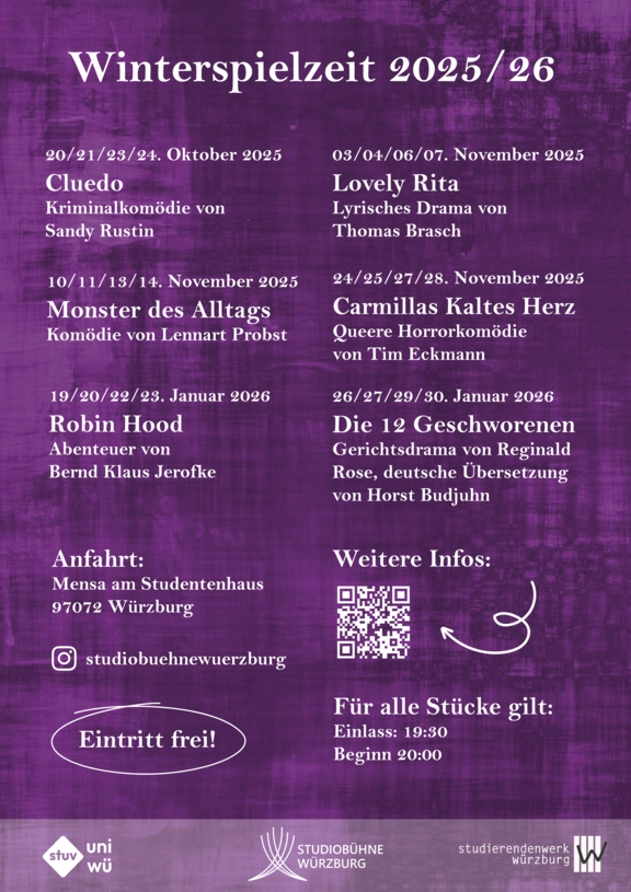 Vom 20. Oktober bis zum 30. Januar verwandelt die studentische Theatergruppe der Studiobühne die Mensa am Studentenhaus erneut in ein kleines Theater und bringt für Sie insgesamt 6 Stücke auf die Bühne.